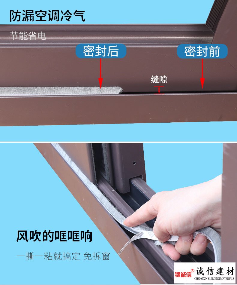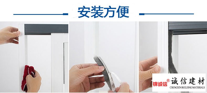 安裝方便,首先清潔被粘貼表面,按需用剪刀裁截密封毛條,揭下一小段背貼離型紙,邊貼邊撕下離型紙,將密封毛條沿著框向下延伸,并不斷壓緊毛條即可安裝成功。